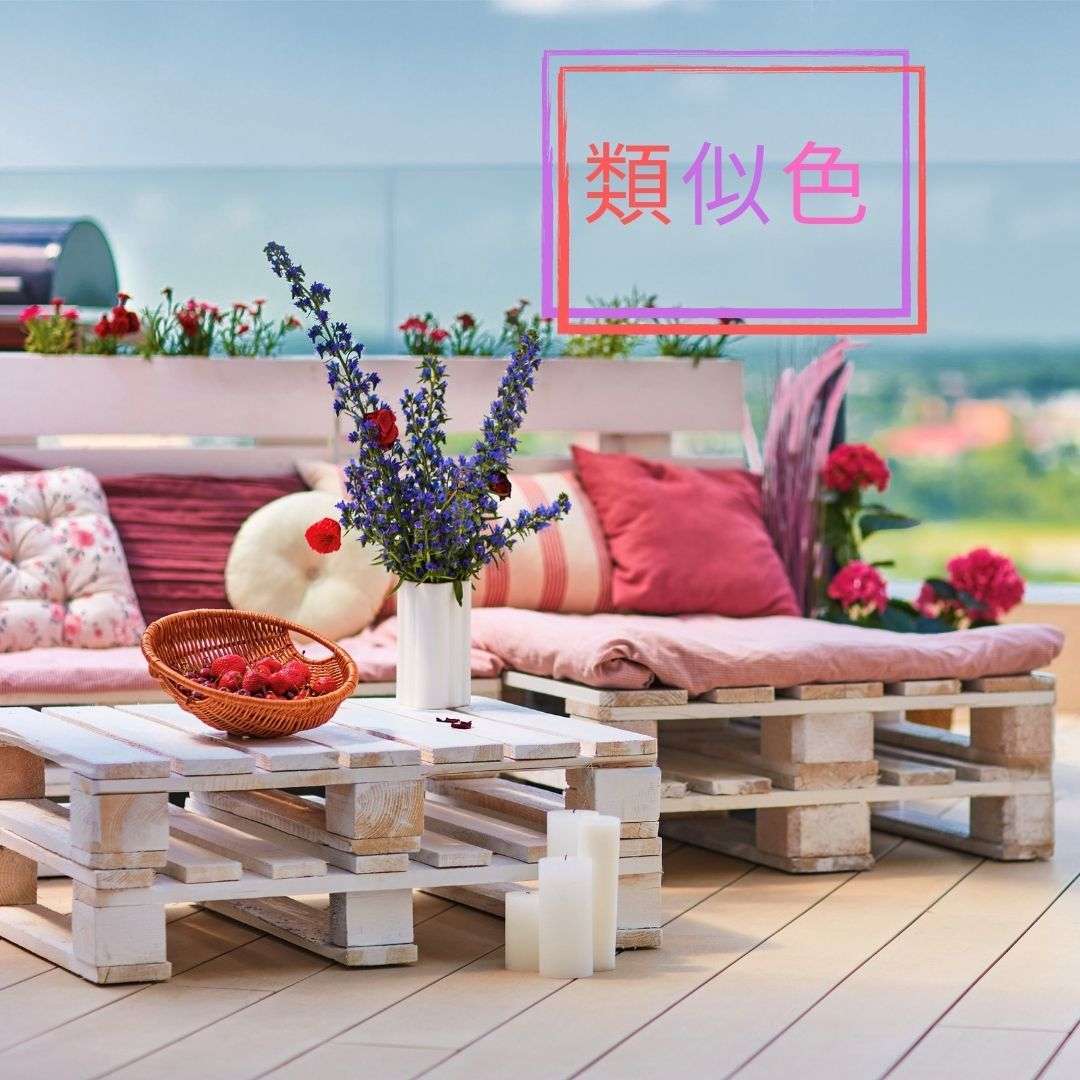 色相(色の種類)が近い色の組み合わせで、紫と赤、赤とオレンジ、オレンジと黄色、黄色と緑、緑と青、青と紫などで、鮮やかな色を使っても、インテリアにまとまった印象をあたえることができます。