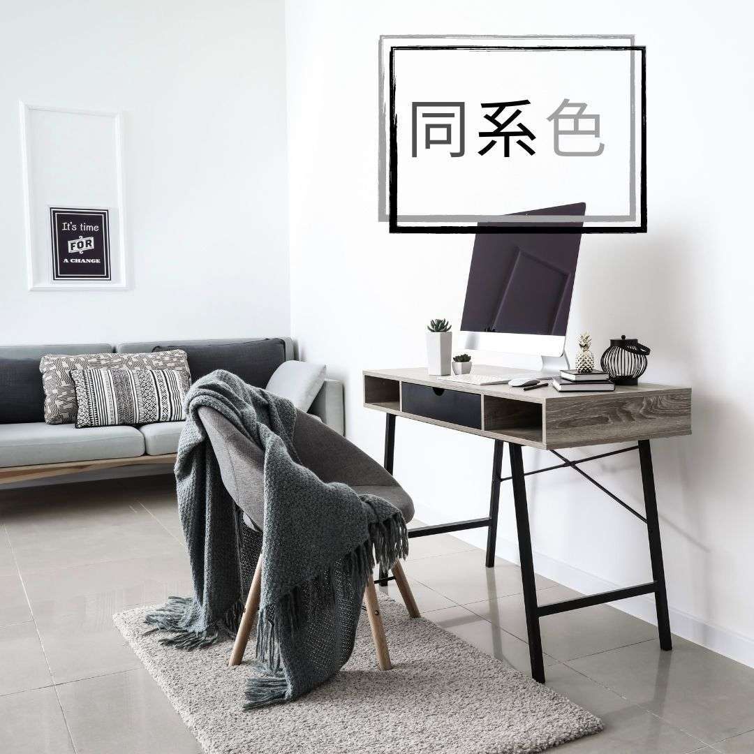 例えば、壁紙とソファ—のホワイトがベースカラー、床材のライトベージュがアソートカラー、クッションのグレーがアクセントカラーといった組み合わせになります。