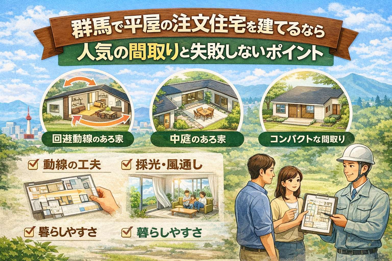 群馬で平屋の注文住宅を建てる際は、間取りの工夫が暮らしやすさを大きく左右します。回遊動線や中庭、コンパクト設計など、人気の間取りを参考にしながら、自分たちに合ったプランを検討することが重要です。